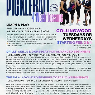 Over the course of this 4-week program, we’ll dial in one key Big 4 stroke each week—along with the smart strategies that make them truly effective on the court. We’ll break down dinking (technique, movement, and communication), master 3rd-shot drops and drives while learning how to confidently transition to the NVZ, sharpen volley skills (rolls, punches, and blocks), and fine-tune serve and return with a focus on purpose, positioning, placement, and tactical decision-making. This program is perfect for those who can already execute these shots consistently and are ready to take them to the next level.